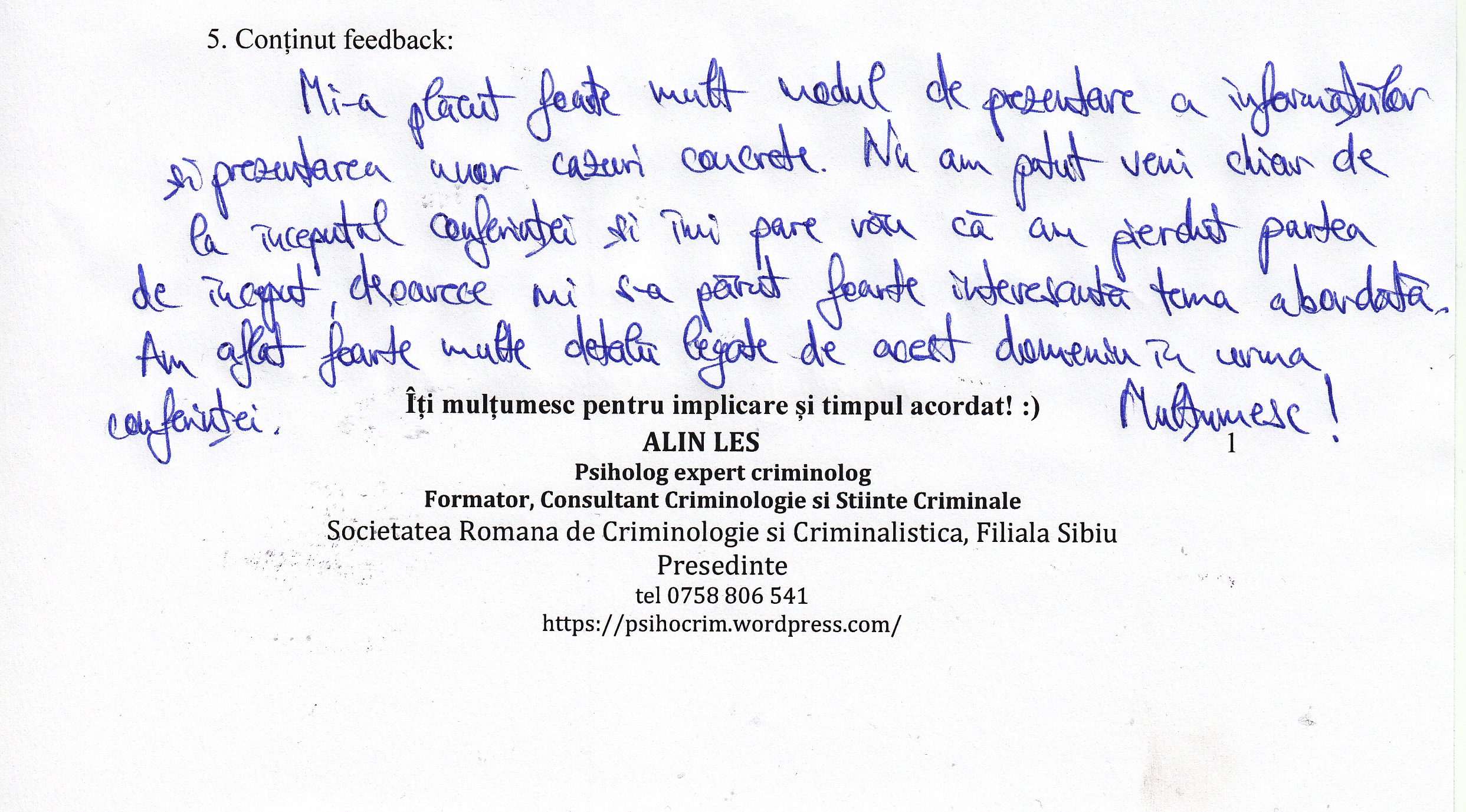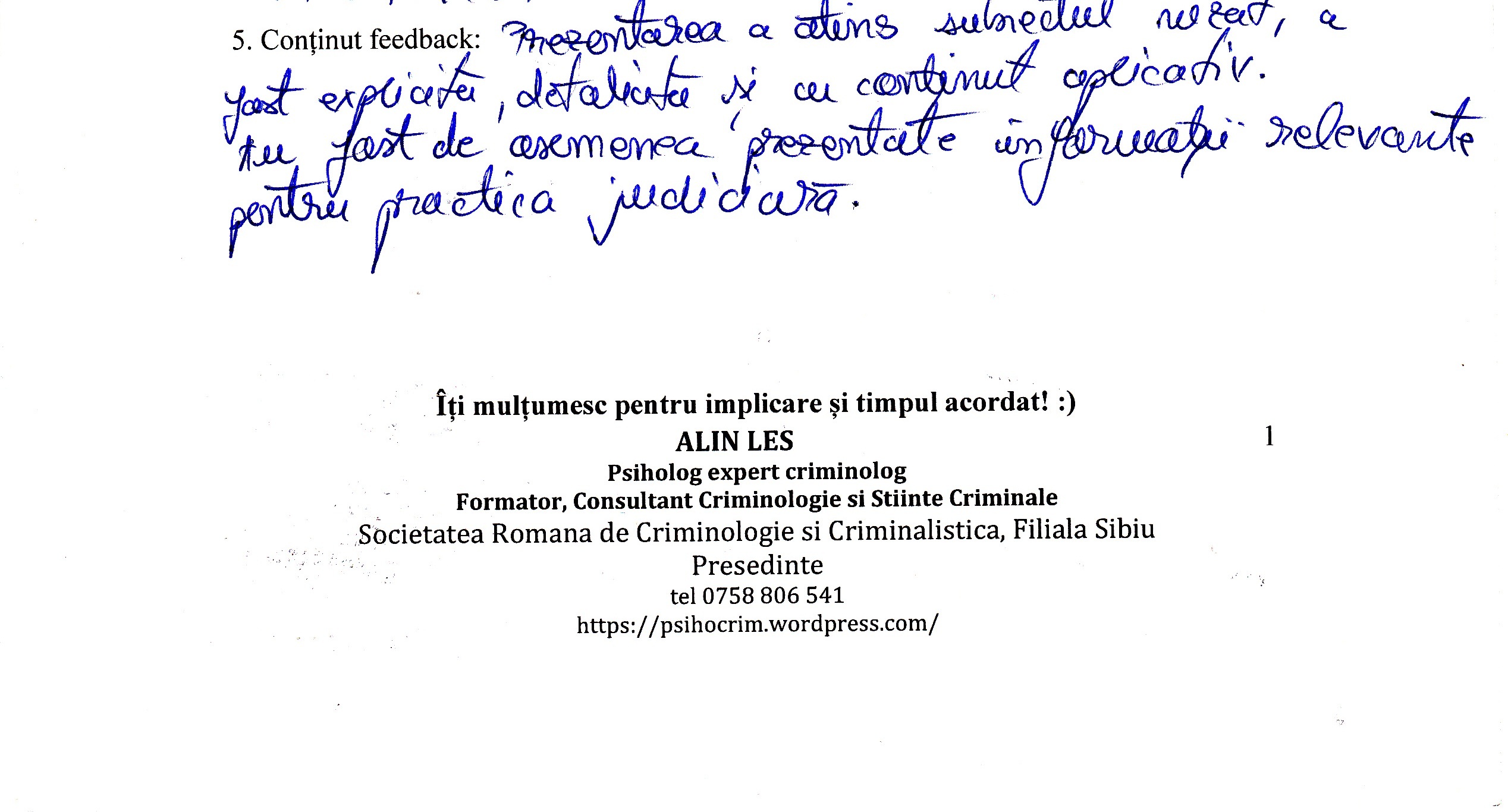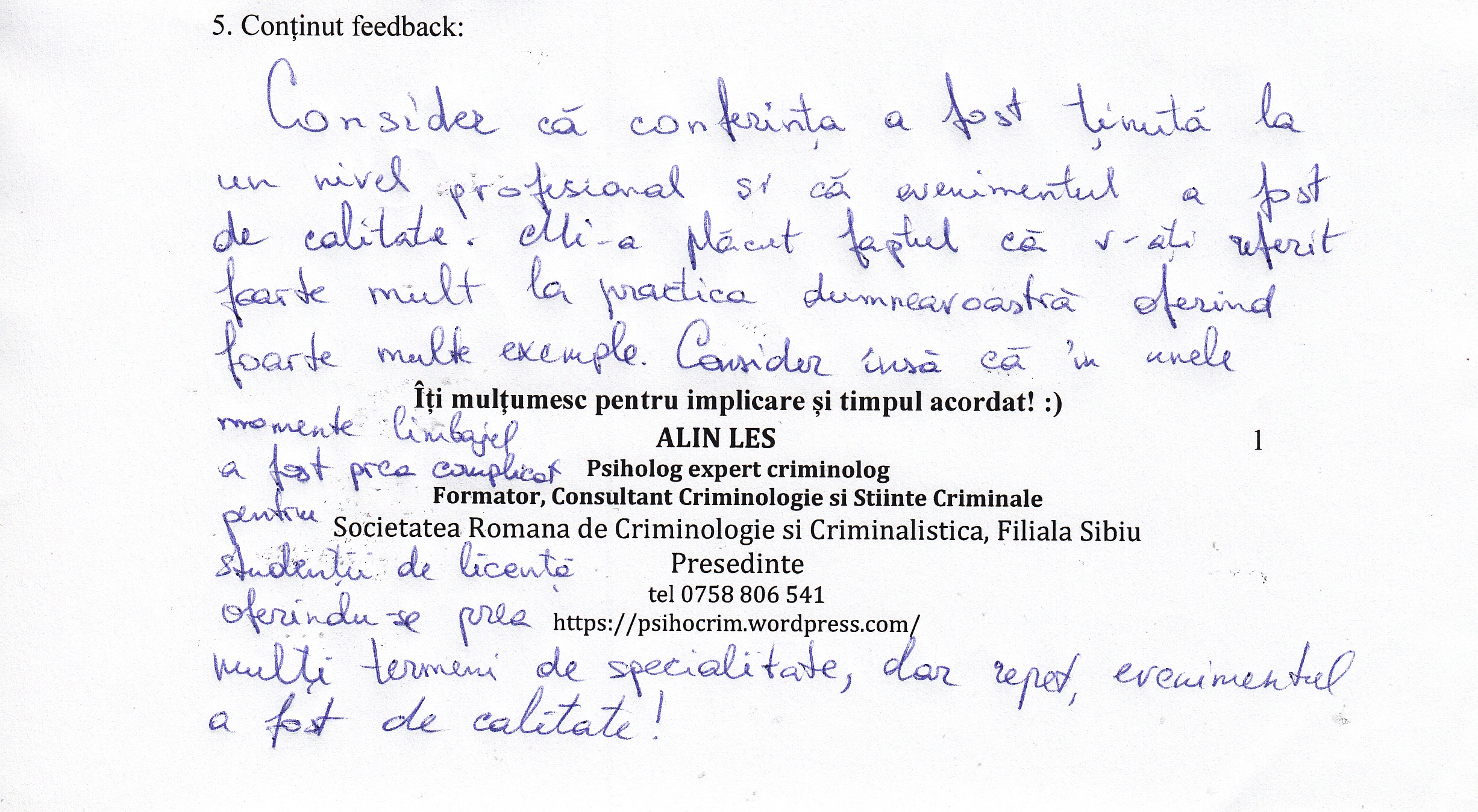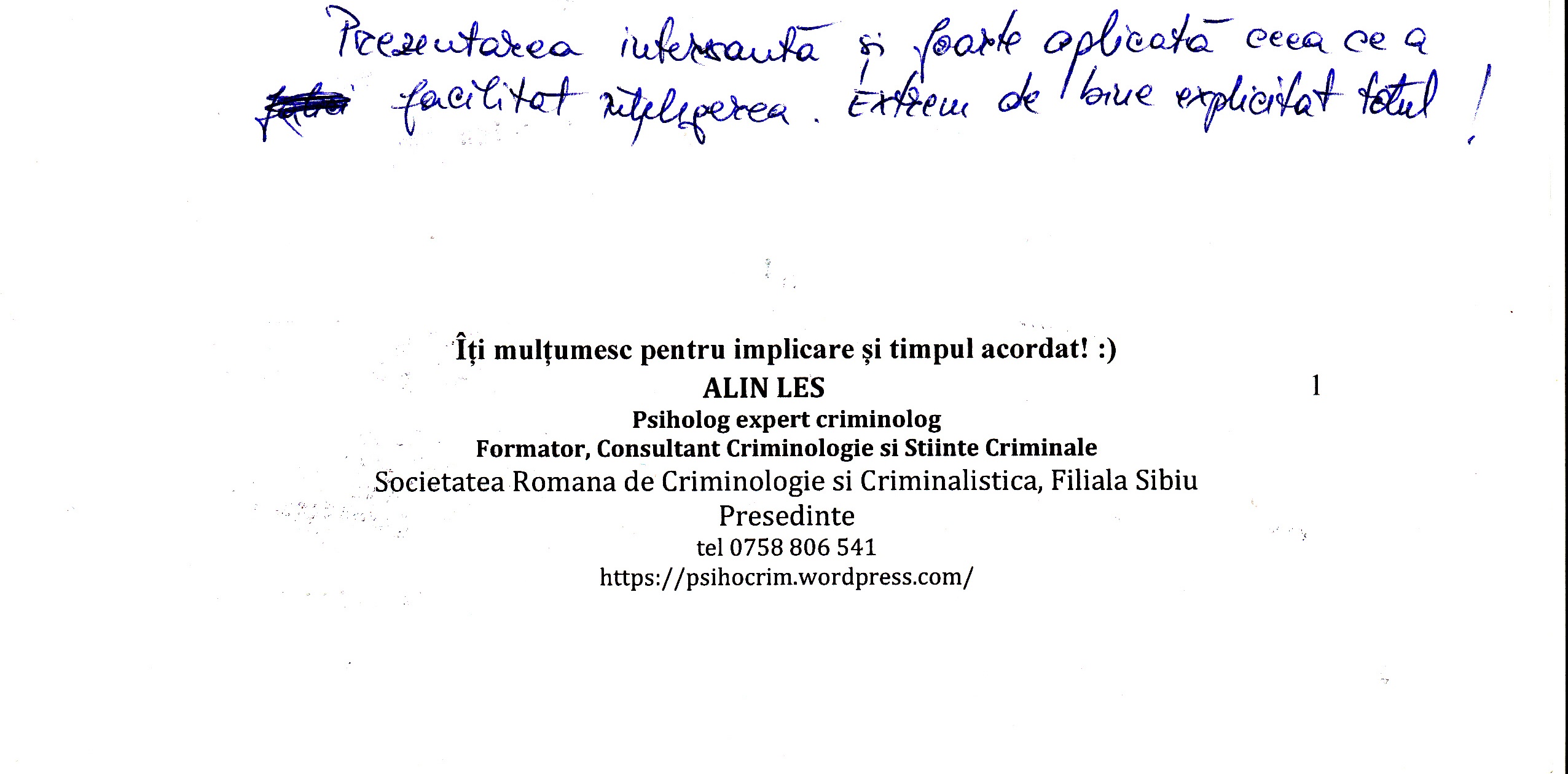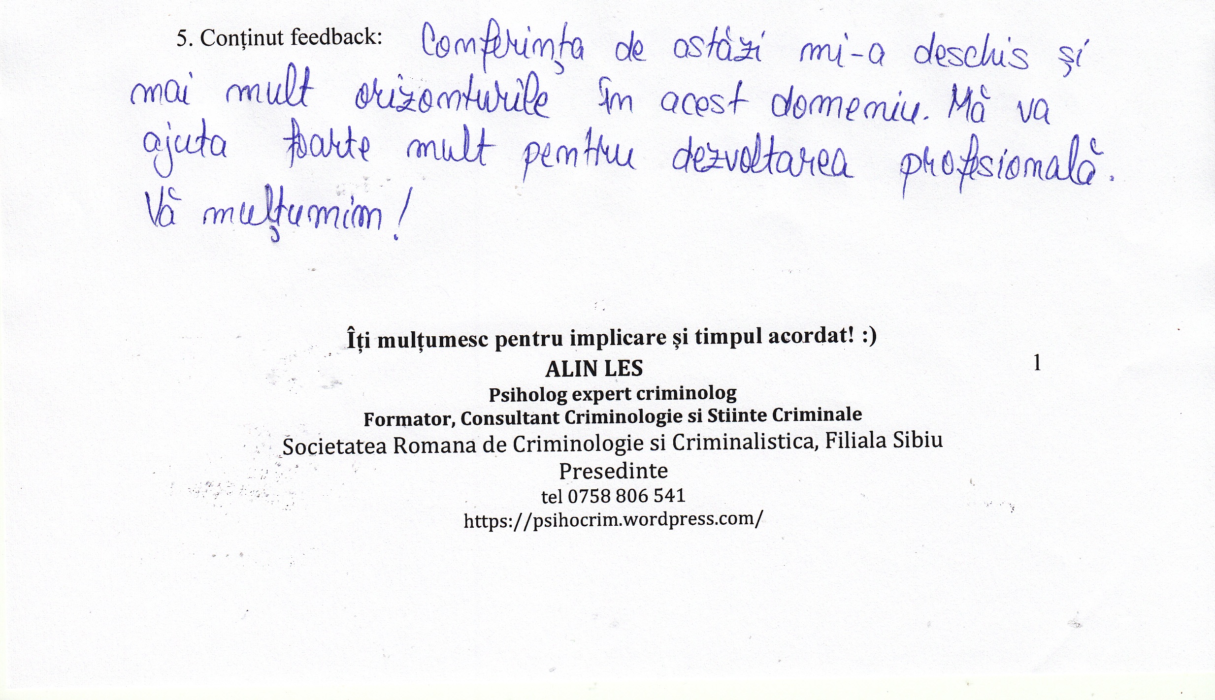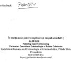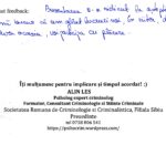 A le conferenția studenților la psihologie și masteranzilor în psihologie clinică judiciară despre importanța expertizei criminologice realizată în actul procesual din România a reprezentat un demers profesional la care m-am angajat cu drag.