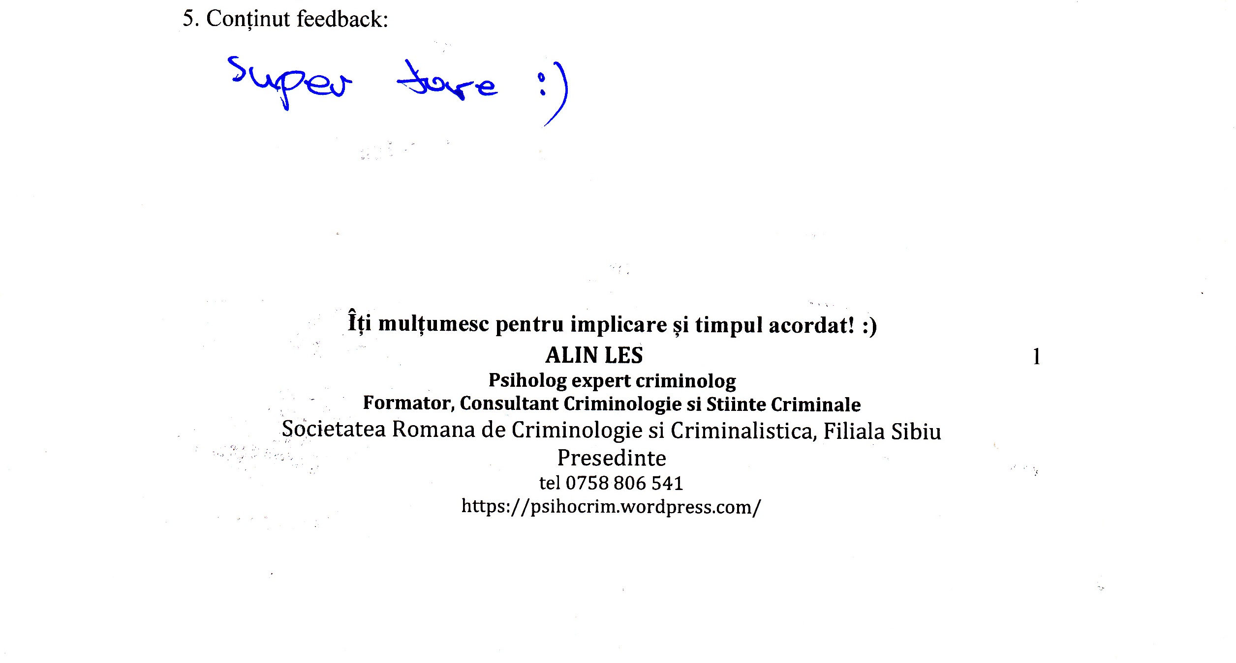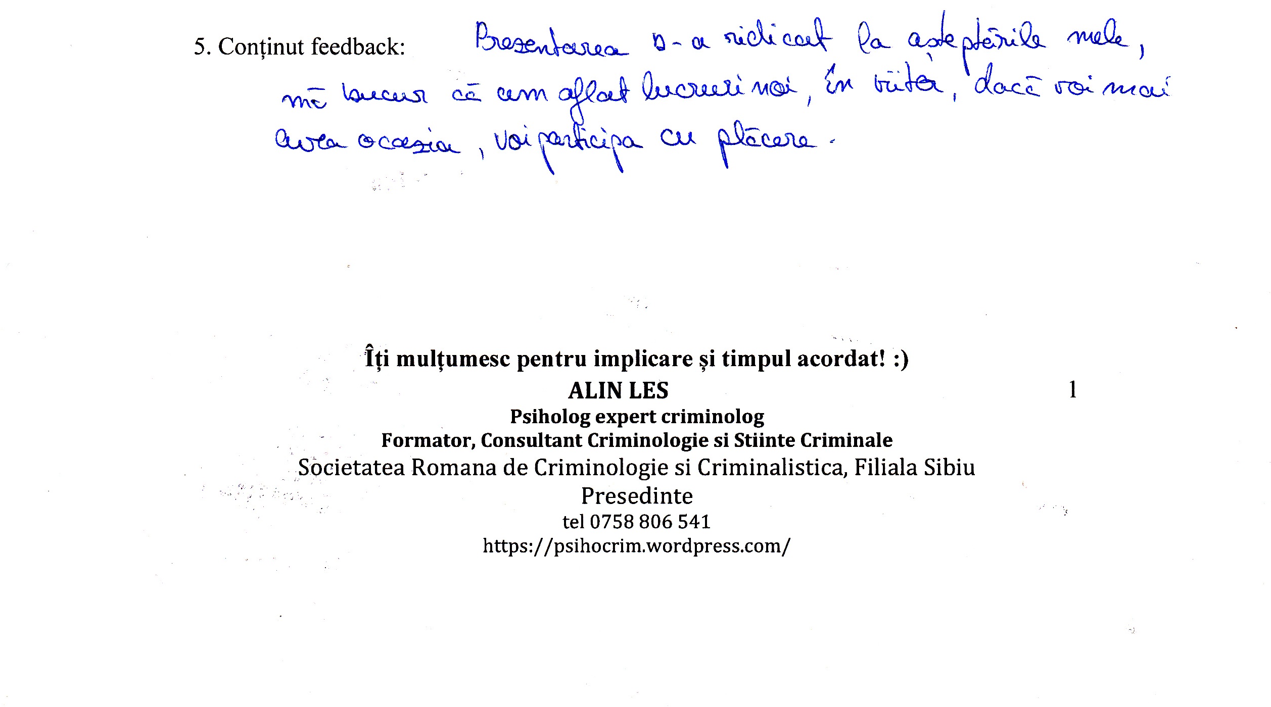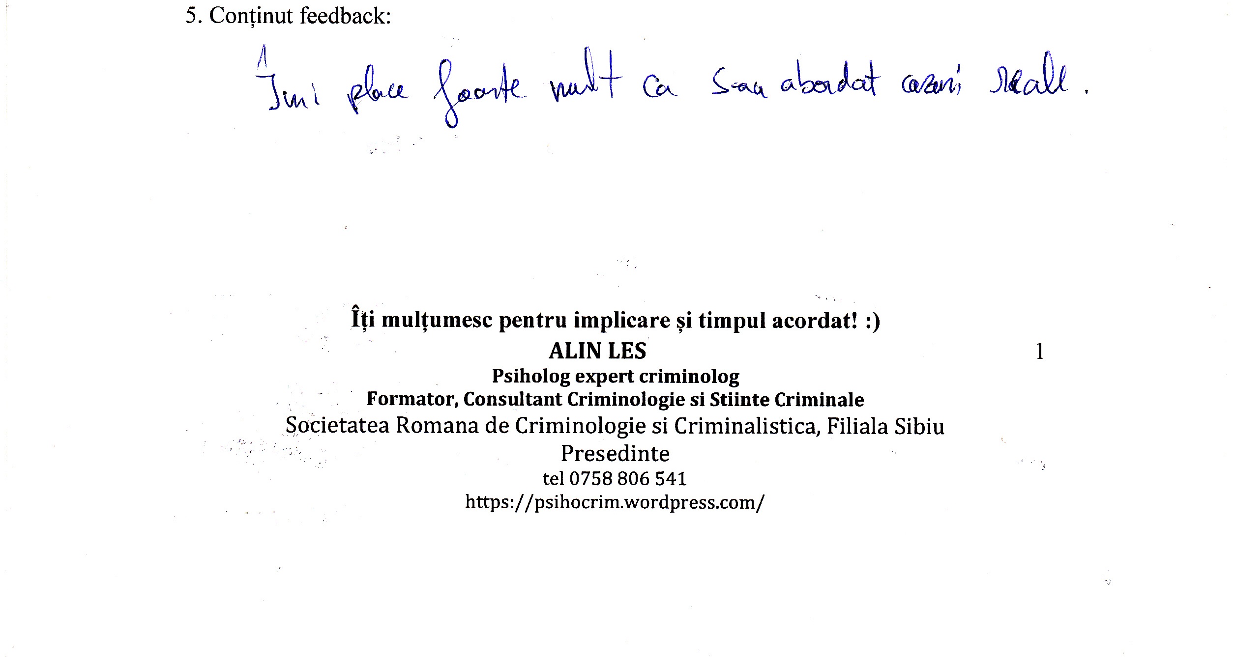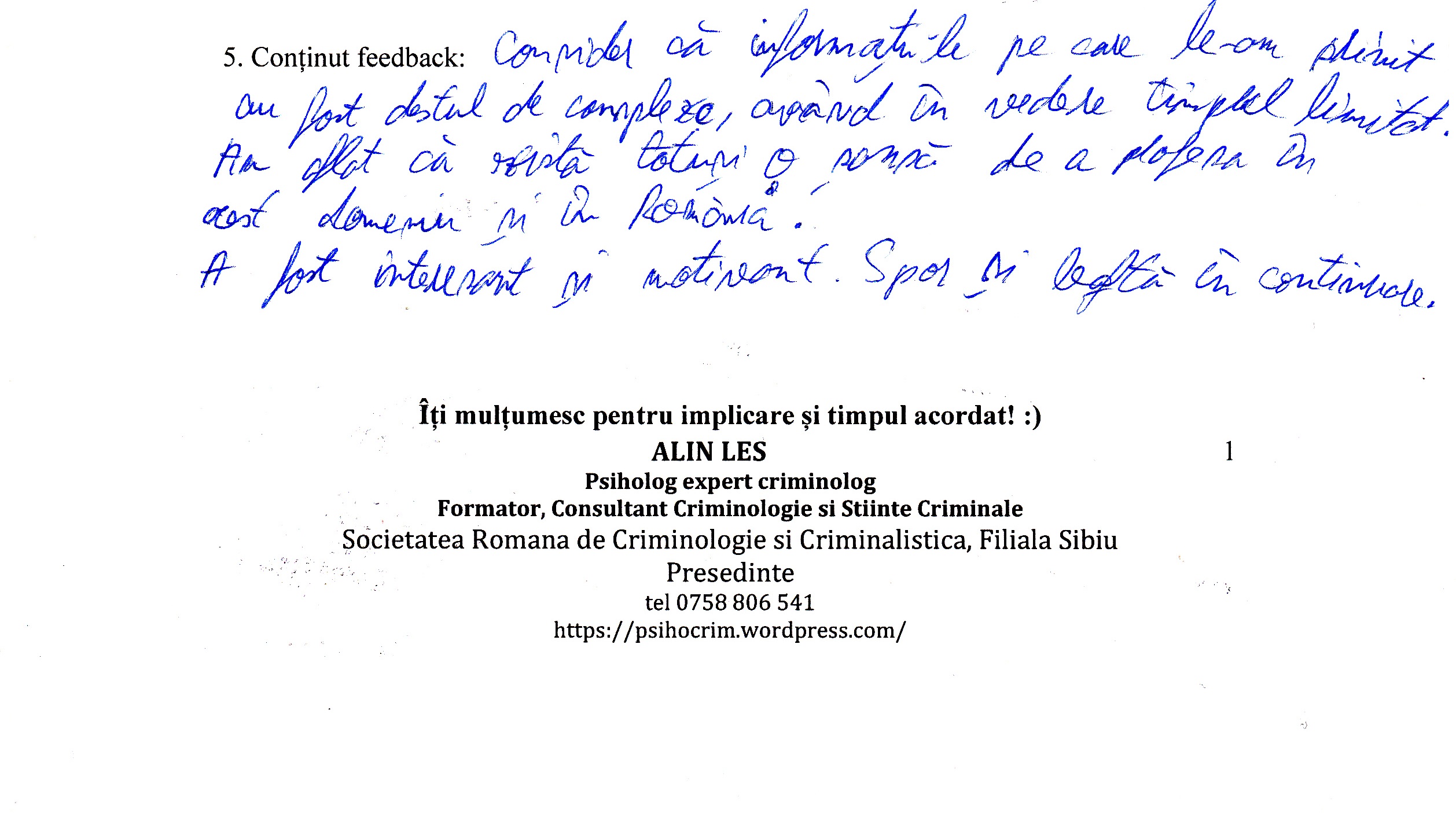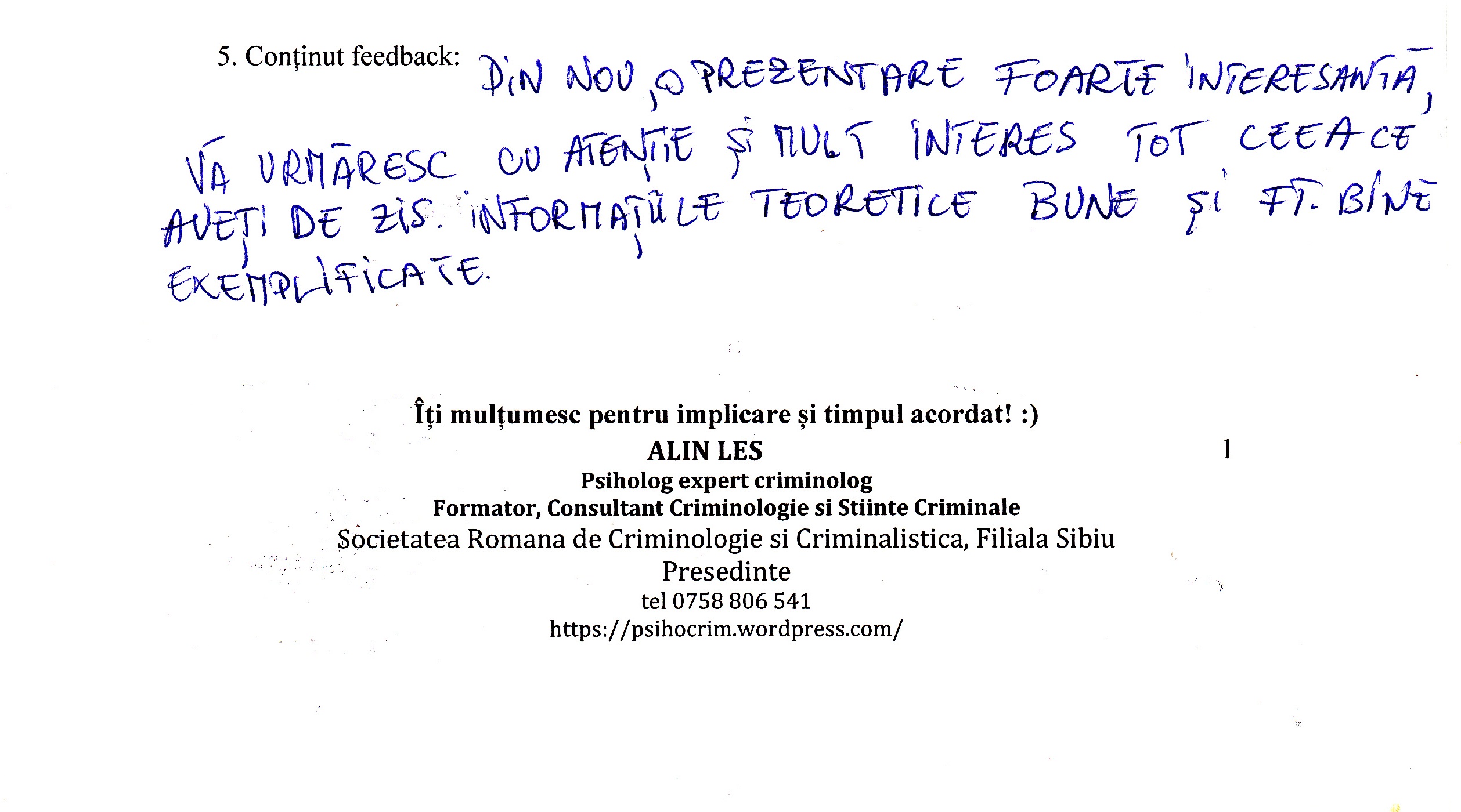 A le conferenția studenților la psihologie și masteranzilor în psihologie clinică judiciară despre importanța expertizei criminologice realizată în actul procesual din România a reprezentat un demers profesional la care m-am angajat cu drag.